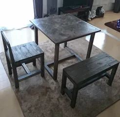 ヘリンボーン ダイニングテーブル 3点セット 2年前の作品 75×75 天板に初めてのヘリンボーン(工房の松本さん提案)ここまで大きな作品作りにドキドキから入ってからの…私の中で1番の最高の作品♡椅子の背もたれにも、こだわりを言ってその通りに教えてくれて、作れた椅子。 出来上がりまで、一緒に悩んで・考えてくれて作