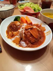 煮込みハンバーグを作りました! ケチャップ+ウスターソース+コンソメ+赤ワインに生クリームかけただけで、めちゃ美味しかったです😋 一瞬でなくなった🤣