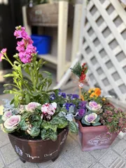 フラワーマーケットで買ってきたお花たち 昨日、極寒の中🚗³₃鴻巣フラワーマーケットに行ってきてお迎えしたお花たちを寄せ植えしました🌸寄せ植えの状態になって売り物であったお花たちを写真撮ってマネしてみたんですが、センスの問題⁉️ なんか、違うんだよなー🤔みたいな💦私としては……の精一杯の寄せ植えですが、今日も寒かった