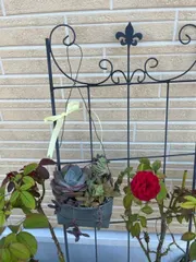 多肉グリーンW S に参加してきましたT29 きょうは楽しいひと時をありがとうございました❗️同じ素材なのにみんな顔がちがいます😍右→が私のです! 帰宅してとりあえず玄関前のトレリスにかけてみました🎃