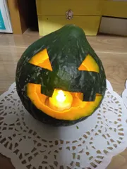 収穫したカボチャで、ジャックオーランタン🎃を作りました😆中に100均のキャンドルライトを使って雰囲気を出してみました😆🌼娘が、先日のサツマイモに続き、ジャックオーランタンも幼稚園に持って行くと張り切ってました笑っ
