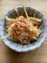 大根サラダ、作ってみた。 フライング収穫した大根で見よう見まねって感じで、ネットで調べたレシピを参考にちゃちゃっと。頑張ったつもりだけど太さがバラバラ。5分くらい水に晒すらしいです。ボウルにしょうゆ、ごま油、お酢、砂糖、白すりごまを適量で混ぜてドレッシング完成。ココで、水に晒した大根をクッキングペーパーでしっかり拭いて水気を