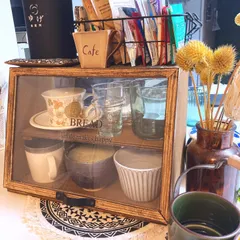Breadcaseを作りました!最初はパンを入れてましたが、今はお気に入りのカップを入れて、キッチンカウンターのカフェコーナーにて使ってます♪扉部分は100均のフレームを使いました文字部分は、娘が推し活で得た知識で、透明シールを作ってくれました!両面から中が見えるので、飾り棚としても使え