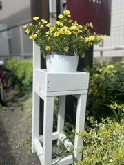 チェア型ミディアムガーデンスタンド 台風が心配で玄関口に避難してましたが、大丈夫そうだったので、定位置にもどりました🙆♀️ 花台がほしくてWSに参加しはじめたのに、最近はDIY熱のほうがあついです🤣w