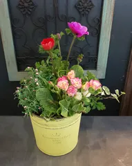 球根を入れた寄せ植え 午前中…姉と一緒にgreen🌱WSに参加✨ ブリキの鉢を3色から選び…ジュリアンは縁にピンクの入った可愛いのを選んで💕アネモネはピンクと赤2色入ってたちょっとお得感があるのを選ぶ🎶初めブルーの鉢を選んだか…お花に合わせ黄色に決定植える位置を確認しながら…完成✨゚+.ヽ(≧▽≦)ノ.+゚✨家