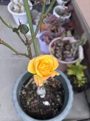 黄色いバラ 新苗で春先に買ったバラ😊庭の隅の方でひっそり一輪咲いてました🤭慌てて玄関先に💖