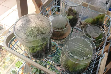 100均のガラス容器とLEDライトでテラリウム♪小さな容器に土や苔をセッティングしたら、大きな容器をひっくり返して被せます。この方法は作業しやすいので作るのが楽だし、お世話やお手入れも簡単にできますよ😊