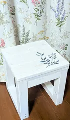 ミニベンチ🎃☘ WSでのミニベンチの作品です💕 工房に、超撥水のホワイトの塗料が新しくお目見えしたらしくて、塗ってみました⚒️ ピュアホワイトの塗料に少し水を入れた薄塗りが流行っていましたが、何もしなくても普通に薄塗りになりました🌟 葉っぱの模様のステンシルをして、褒めてもらったので実