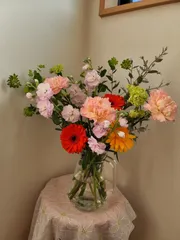 3日後です。 教えて頂いた様に3日後に茎を2センチ位切って水上げしたらガーベラの首がシャキっとしました。お花🌸🌻🌹🌺🍀が部屋に有るだけでいやされます。特にストックの香りが大好きで息子達も『良い香りだね』ってお花の名前教えちゃいました。 楽しくとても勉強になった講義でした。スタッフや方に感謝です。