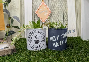 午前のWS後に店舗を変えて、リメ缶のWSに参加してきました😆今まで大きい缶でしか作った事なかったので、今回は小さい缶にしました🥫小さい缶は2つ作れるので、色味を変えて作れておトクかも?(考え方次第💦)左側のグレーの方は裏側もステンシルしてありますデコボコしてるので、ステンシルするの難しかったです💦真