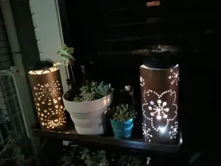 「アレンジアワード2023【アイアン風ペイント塩ビ灯り】」 塩ビ灯りを多肉コーナーに設置しました。玄関先が明るくなりました。🌟ソーラーガーデンライトの種類によって色が選べます。