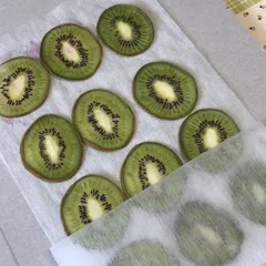 キウイをプレスしてみました キウイを薄くスライスしてからプレスしてみました。この方法だと、フルーツの形がはっきりと残りますね。ただ、食品乾燥機で乾燥させたときのように、酸っぱそうな匂いがありますね~。(≧▽≦) これだけ形がはっきり残ってくれると、クッキングではなくアクセサリーの作品へと発展できそうですね。乾燥させる