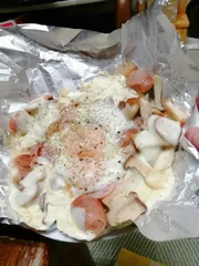 いとしのエリーでエッグベネディクト風 ジャジャジャーーーーン✨ 初収穫のエリンギでクッキングぅぅぅです。 まず、ウインナーとエリンギを炒めます♪別のフライパンに、くっつかないタイプのホイルを敷き、水にくぐらせたライスペーパーを1枚敷き、先程のエリンギたちを乗せます。ドーナツ状にね♥️溶けるチーズをパラパラっと置いて、