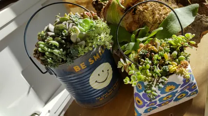 多肉ちゃんの寄植え こんばんは~✨今日も まったりの ぷりぶりです☺️そろそろ生活を改めなければと思いつつ、昨晩ふいに多肉ちゃんを寄植えましたよ🤭年末にリメ缶を入手しまして。ちょこちょこ多肉ちゃんも手に入れて。ちまちましてみましたよ〜💓寄り添う リメ缶🤭😚💓📸✨パシャリ少々セダムさんが蒸れてるっぽいコもいましたが…💦