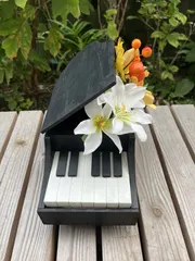 ピアノ型プランターカバー 木津川店ワークショップにいってきました🎵以前からこのプランターを作る時、アレンジをしようと考えていました。それは、蓋を付けてグランドピアノにすることです🎹🎵スタッフさんにも協力していただき、満足いく作品が作ることができました😊蓋を閉めたら小物入れとして、蓋を開けるとお花を飾ってインテリア