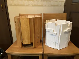端材でプランターカバー 大掃除をしなくてはいけないというのに、端材の段ボール箱📦を見ていたら急に作りたくなってしまうから困ったものです😅八角形と六角形の板の周囲に20㎝〜35㎝の板を打ち付けていきました。ピッタリサイズにならず(歪みが多くて)細い棒状のものや丸棒や端切のような板などパッチワークをしている様に組み合わせて形成