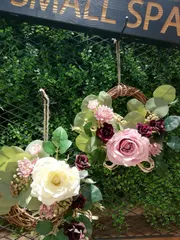シルクフラワーのローズリース シルクフラワーのローズリース作りを楽しんできました。大きなバラの位置を決めてから周りにモリモリ~ご一緒いただいた方々の作品がとても素敵な作品ばかりで自分の作品の仕上がりが心配でしたが大満足の作品になりました初めての工房でららぽーとの中にあるカインズさんなのですがららぽーとで迷子になりなんとかたどり着