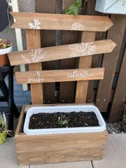 先日焚付材で作ったプランターですね。ノコなしでカッコいいプランターになってすごいなと思ってました😊ステンシルがとても素敵❣️リバーシブルも良いですね😃👍✨