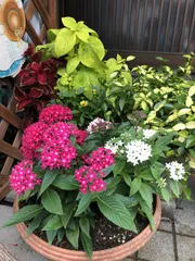 玄関の💐花ペンタス、コリウス、黄金カズラ 6月初旬玄関の花💐の寄せ植えを庭で育てて綺麗なときに出して飾って😊楽しんでいます。
