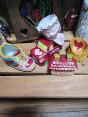 モルタル塗装 ぱんださんからいただいた作品に塗装完成しました✨お家と靴と切り株は最後にオーブン陶芸で使ったコート剤を塗って完成。ツヤが出ました。ぱんださんありがとうございました✨