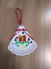 クリスマス オーナメント スクエアで見て かわいいので 作って見たかった オーナメント。子どものふりして 作って来ました。プレゼントが 黄色で目立たなかったので、赤でステンシルしたら 大変な事になってしまいました。プレゼントは布で作ってボンドでつけました!