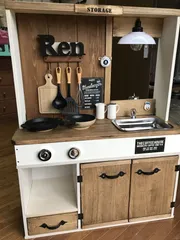 アレンジアワード2023 ままごとキッチン 男の子用 男の子用につくりました。下の扉部分はカラーボックスをアレンジして作りました。小物は100均の物を使ってます。上下別々になるので使わなくなったら下の部分は収納として使う事ができます