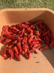 赤くなったシシトウの実 もう収穫が終わったシシトウの枝を抜いて庭の隅に置きっぱなしにしていました。一念発起、今朝はごみ収集の日なので片付けて袋に入れました。でも枝についている実がもったいなく感じて採ってみました。よく乾燥させて種を取り出してみたいとみたいと思います。こんなにたくさん要らなかったかも。昭和生まれはもったいなと