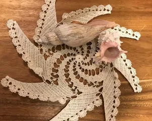 レース編み ドイリー 渦 アイロンで仕上げたら綺麗なのですが、暑いので💦スチームかけずに投稿致します。 やっぱり編み物が好きだなぁって、休み休み編んでます。