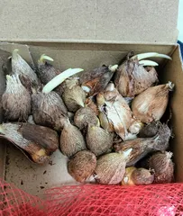 フリージアが箱の中で芽を出し始めました。 冷蔵チューリップ🌷と同じ日に植えようと居室に置いてたフリージアの芽が出てました。赤い網で傷つきそうだったので早速植える事にしました。DAISOのスクエア鉢に水抜き穴を多めに開け、10球ずつ植えました。水やり後、追加で雨に打たせてます。