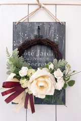 シルクフラワーを使ったリースボード WS作品【シルクフラワーを使ったリースボード】自宅にてアレンジさせて頂きました🏠いつも自己流でリースを作っていたのでどうしようかなぁ?と思ったけど、やっぱり参加すると楽しい(*ˊ˘ˋ*)。♪:*°♥️店内ではボードにステイン剤(1色)を塗ってリース作って帰宅😅お家でのんびりアレンジしました🎨ボードを