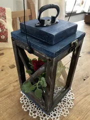 ランタンボックス 朝一番で作ってきたランタンボックス。キットなので組み立てて出来上がりました。夏休み工作ということもありわたし以外殆どが小学生の親子連れで、いつもと少し違う雰囲気😅。ささっと作って家に持ち帰りアレンジ。WSでランタンを作れなかったのでこちらで少し真似て作りました。意外と手がかかりましたが家にあるものを
