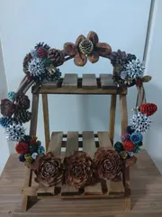 自然素材のリース 今日は公共施設のイベントに参加してきました。作ったのは、自然素材で作るリース。素材はこのイベントのために1年かけて職員の方が集めて、乾燥、加工した物のみ9種類。中にはこの近辺では取れないカラマツも。加工するのも大変そうですが、それよりも最近は素材集めが大変だとか…。そんな職員さんの苦労に感謝しながら