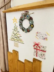 ■作品の工夫ポイントを一言!「サンタクロース様」=「旦那様」メッセージに気が付いてくれるかな🎁 クリスマスツリー🌲とプレゼントの箱🎁をマスキングテープで作りました😃✨キッズ工作のウッドリース🪅