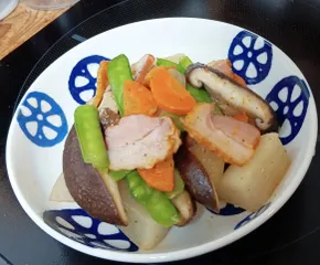 ベーコンと野菜炒め ■材料 大根 、人参、絹さや、椎茸、ベーコン ■作り方 大根、人参を中華だしを入れたスープで柔らかく煮る 、フライパンでベーコンを炒め野菜全部を入れ、塩、コショウで炒める ■工夫ポイント 根菜を柔らかく煮てから炒める