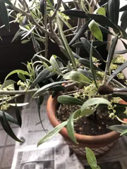 5月7日本日、大雨予報。オリーブの可愛い花がちょうど受粉の時期なので、玄関に避難、筆で人工受粉してみました。
