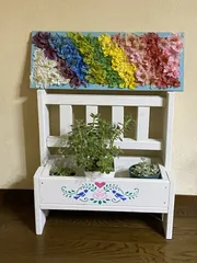 想いを込めて「誰かに贈るもの」 お花好きな友人に贈ります。🤗カインズのWSで作ったベンチ型プランターにステンシルをして可愛く仕上げました。中にはいい香りのするアロマティカスを入れて。両サイドには、これから暖かくなると大きくなるであろう多肉ちゃんを。おまけにプリザ加工した花を虹の🌈イメージで作った縦置きにも横置きにも出来るボードアレ