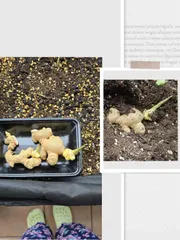 ベランダ菜園2025(生姜_①芽が出たので植えてみる♪) いつもは新生姜を買ってすぐにカットやスライスをして冷凍保存するんですけど、5個入りパックの囲い生姜を買って数回使ったあと、すっかり忘れていて。。。🫣気づいたら、紙製バッグの中で元気に芽を出していたので「そうだ!根生姜を収穫しよう♪」と思い、ベジトラグに植えてみました🤭🔍️すると、収穫時期は10月にな