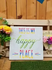 ミニサインボード【Happy Place】 WSでミニサインボード作ってきました✨下地は、ウォルナットを塗って、上にオフホワイトを塗りました。上下をトリコロールカラーにして、真ん中をアップルグリーンとグリーンにしてみました😊💕アレンジでカインズで購入したチェーンを付けて見ました😁チェーンをつけました玄関のフェンス風壁面に飾ってみました。