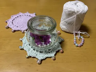 編み物コースター😊 いつもと違う事やってみたい気分になり何作ろうかなぁ…とSeriaをフラフラしていて毛糸に目が止まり暑い時期に毛糸!なんだけどコースターを作ろう!となり毛糸6カラー買って作り始めました😊周りにビーズの飾り編み始める前にビーズを通します あとはサクサク編むだけ😊
