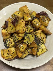 大学芋、作りました 今日はあいにくの雨降りです 午後から来客があるのでおもてなしをしたいなと思い菜園で採れたサツマイモ🍠を使って大学芋を作りました スマホでタレの作り方を調べながら何とか出来上がりました 妻からは美味しいよの一言😋作って良かった