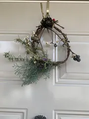 ミニリース 先日、落としたルコウ草の蔓でリースを編んで ヒバ、ローズマリー 香りのあるオトナ雰囲気のミニリースを作りました