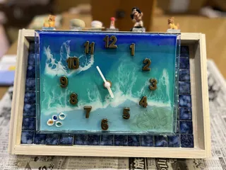 ようやく完成しました。 かなり前から作り始め、とどうしようか試行錯誤しながらようやく完成。まずプラケースに海レジン作り、真ん中に穴を開けます飾りつけと数字を入れました100均の時計作るキットを取り付けわ枠の上にはタイルに貼り付けた沖縄ガチャを付けました枠の中にはキレイなブルーのタイルを貼り