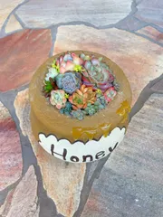 ハニーポット鉢に多肉の寄せ直し✨ 2月にもこちらのモルタル作家さんの可愛いハニーポット鉢の寄せ植えを投稿しましたが、夏の間に見事にポロポロ💦ということで、寄せ直しました😊エケさんたち、良い色してます❤️こんもりとなるように心掛けました😊鉢も可愛いですよね😍ハチミツ垂れてます❤️春までキープできるかな🎶