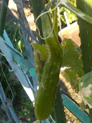 きゅうり11月25日の朝 世話を任せていた母が「倒す」と言ってたけれど、実がなると惜しいんだろうね、今朝も畑を見に行ったら2本なってた! 皆さん、来年の夏は2回きゅうりを栽培しましょうね6月まき(通常)と、8月まき(秋採れ)