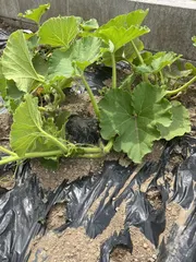 カボチャの摘心をしました 玉ねぎを育てた後、そのままマルチを使いカボチャを植えました 毎年どう摘心したら良いのか悩みます 草が生えなければいいやと半分思っているズボラな自分がいます この苗、初めて種から育てました😊