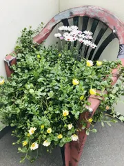 椅子のリメイク スタンプー プラスチックの白い椅子劣化防止に重く見える様に塗ってみた今は花台