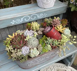 多肉寄植え 春なので🌸先日多肉を寄植えました🤩午後から庭先に折りたたみテーブルとミニベンチを置いて一つ一つゆっくり寄せて楽しんでると道行く人たちが声をかけてくれます☺️自転車で通り過ぎた女性が戻って来て「多肉が見えたから戻って来たワ❣️」とか。「さっき買い物の行きに通って帰りも通ったらまだ何かやってるから覗かせ