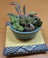 大好きな多肉ちゃん、かわいいです! 畳の敷物が盆栽の豆鉢にぴったりですね!