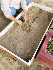 初めての玉ねぎ苗の植え付けと現在の花壇の様子 ニンニクの植え付けと同時に空いていた奥の畑に玉ねぎを植えてみました。玉ねぎ苗は10ポッドなのですぐに終了しちゃいました( ;∀;)初めてなのでこれで良いのかわかりませんが大丈夫でしょう!奥側が玉ねぎ苗を植えた畑です。手前はニンニクの苗を植えました(ホワイト6片)畑の隣にある植木鉢たちです。なんか色々