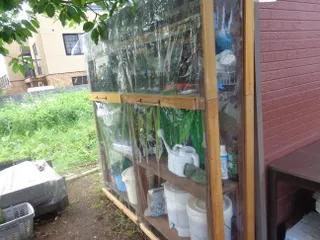 出来たぁ~!完成なのら~!【俺の作業棚でーす】 昨年物置の横に作った作業棚。とても便利なのですが、もうちょっと使いやすくしたいと思い、今回2日間の休みを使い改造しました。ポイント①はもっと丈夫に長持ちさせたいこと。(昨年作ったのですがビニールは冬の寒さと暴風雪にやられてボロボロになりました)それとポイント②はビニールはクリップで止めていたのですが